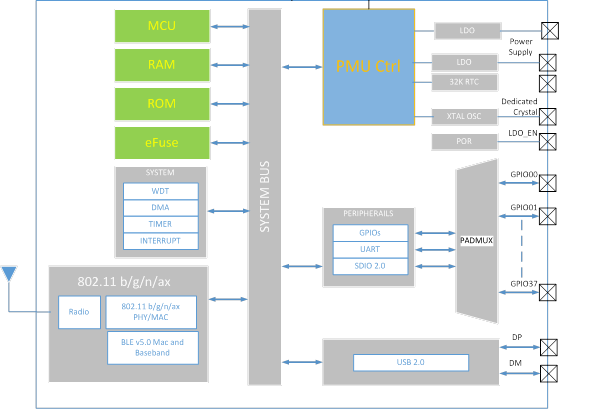 SV6358/SV32WB11 支持IEEE802.11 ax, 向下兼容 IEEE802.11 b/g/n, 集成Bluetooth 5.0(LE), 支持 20/40 MHz 帶寬, 支持2/4/8MHz窄帶模式。